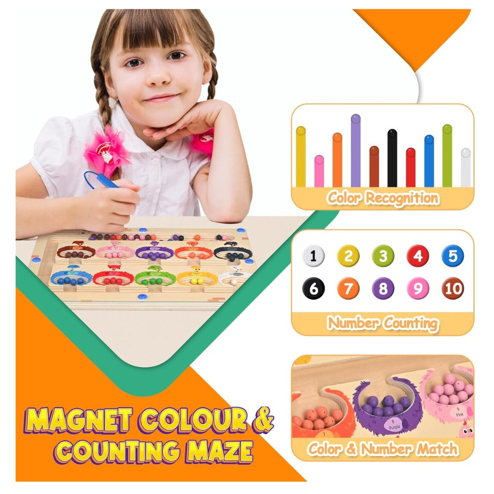 Divertido laberinto de números y colores: este laberinto magnético de madera para niños tiene incorporados 10 baldes de pintura con números del 1 al 10 y 55 cuentas magnéticas. Los niños pueden practicar la combinación de colores y el conteo usando un bolígrafo magnético para mover las 10 cuentas de colores desde la pista hasta el bote de pintura, estimulando el aprendizaje mientras juegan. (Para un mejor uso, mantenga el bolígrafo en posición vertical mientras juega) Educación temprana y desarrollo de capacidades: el tablero de laberinto magnético permite que los niños aprendan jugando. Los niños pueden practicar el conteo, el reconocimiento de colores, la coordinación mano-ojo, la capacidad de emparejamiento y las buenas habilidades motoras. También puede mejorar la capacidad de observación de los niños, clasificar y combinar cuentas de colores y cultivar la concentración y la paciencia de los niños.